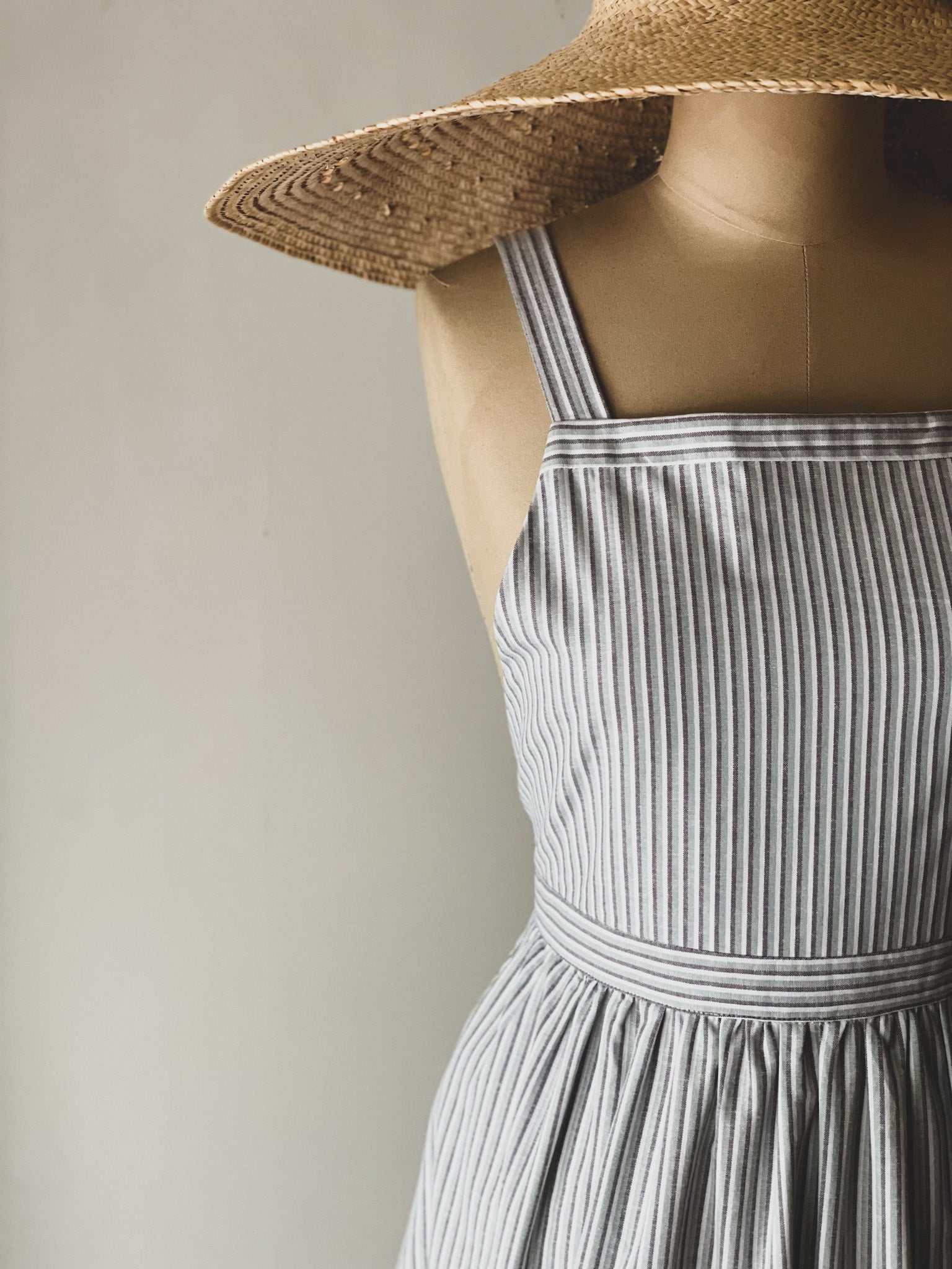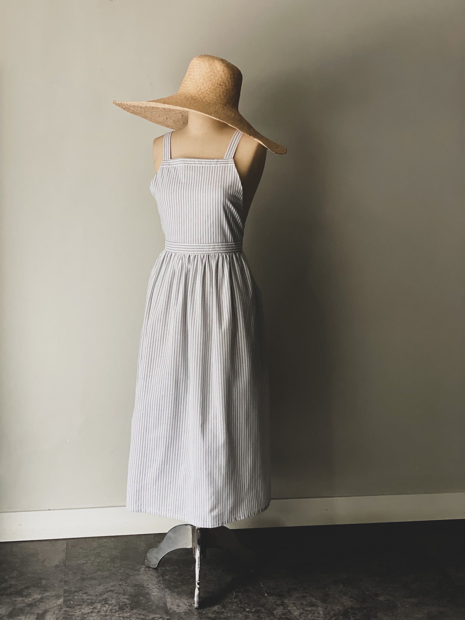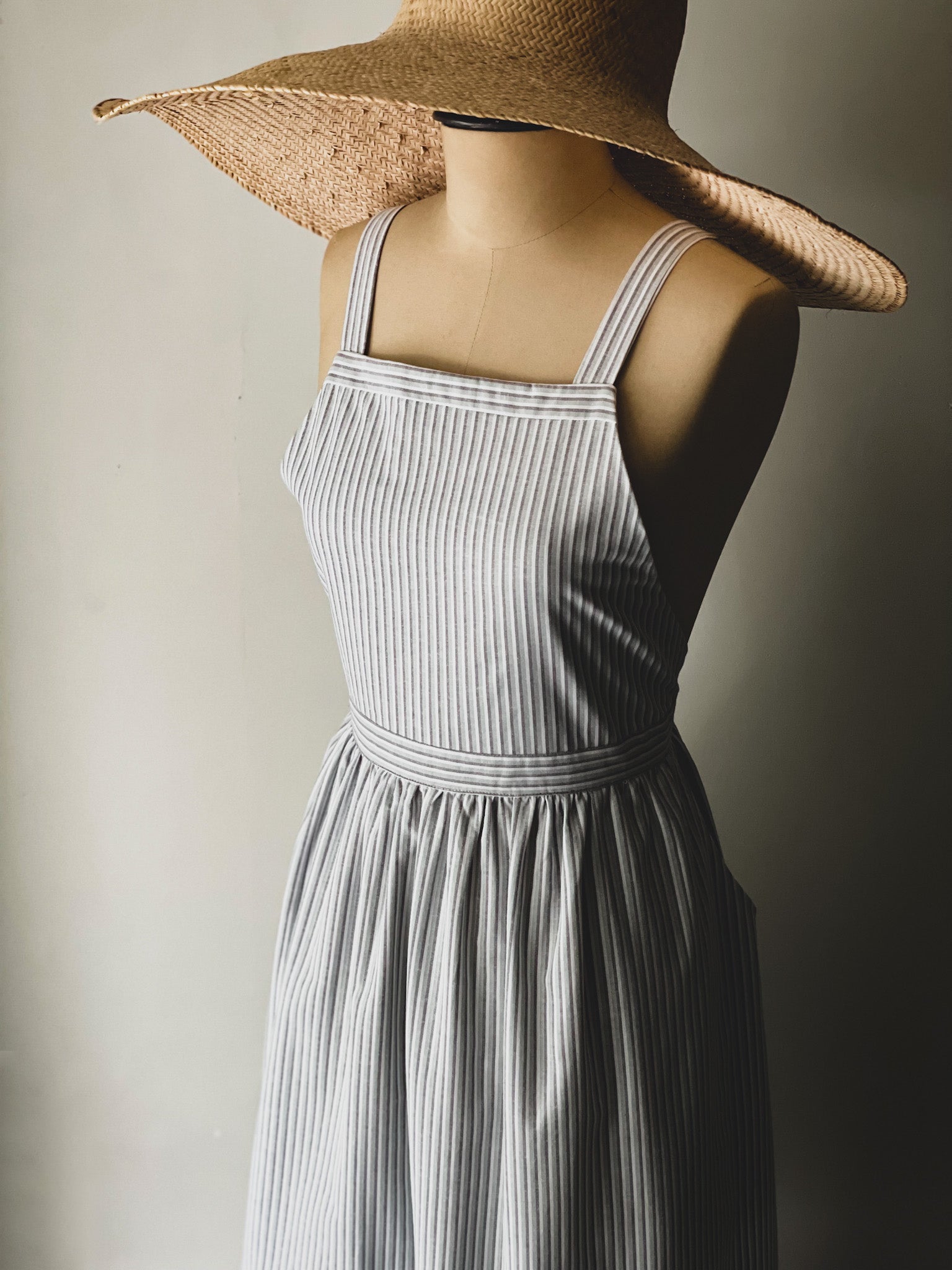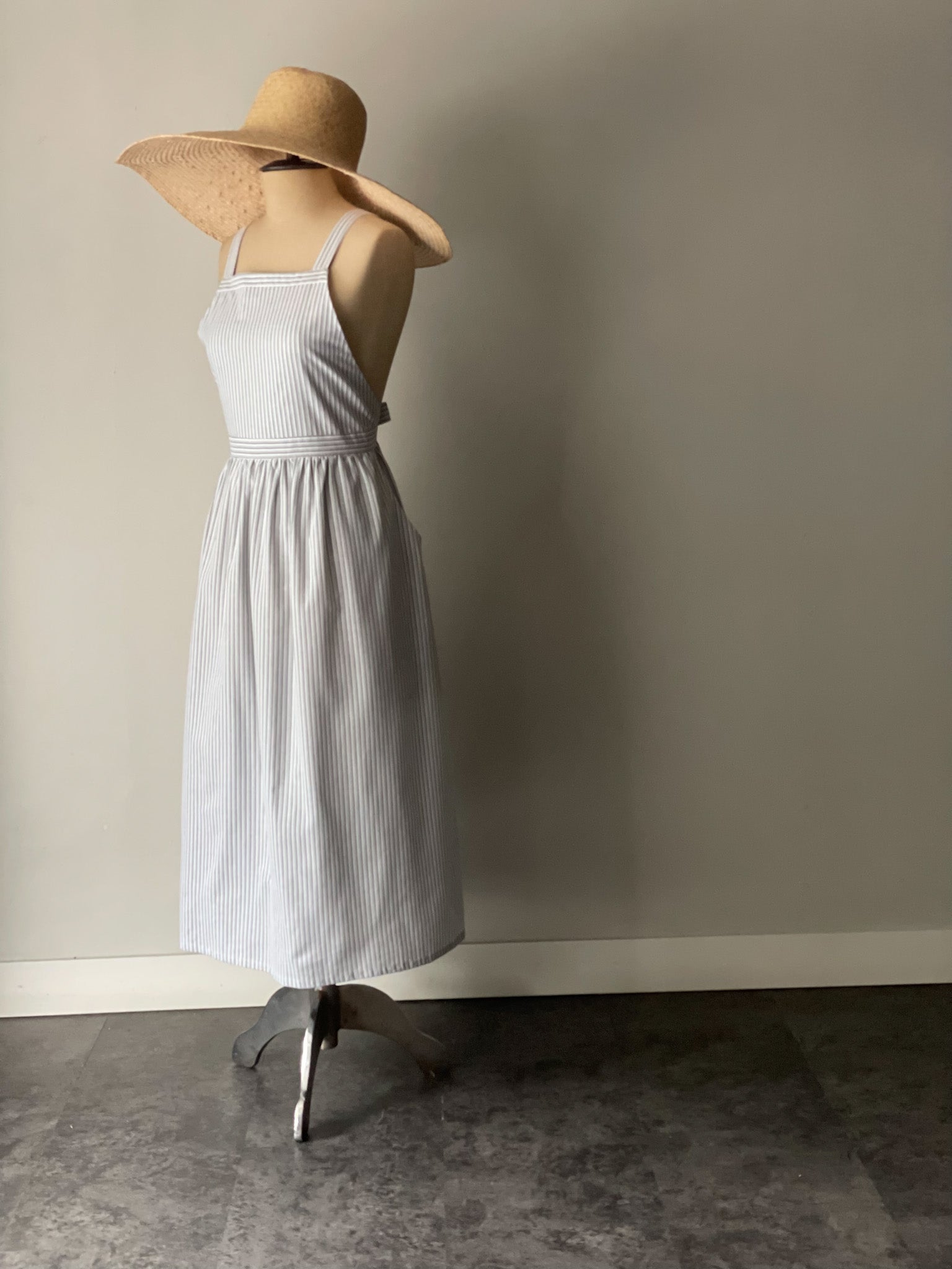 Made from soft striped patterned linen with our signature color of white, light grey and robin’s egg green. Its straps are adjustable making it easy to wear for every body types. Such a sweet looking apron isn’t she?