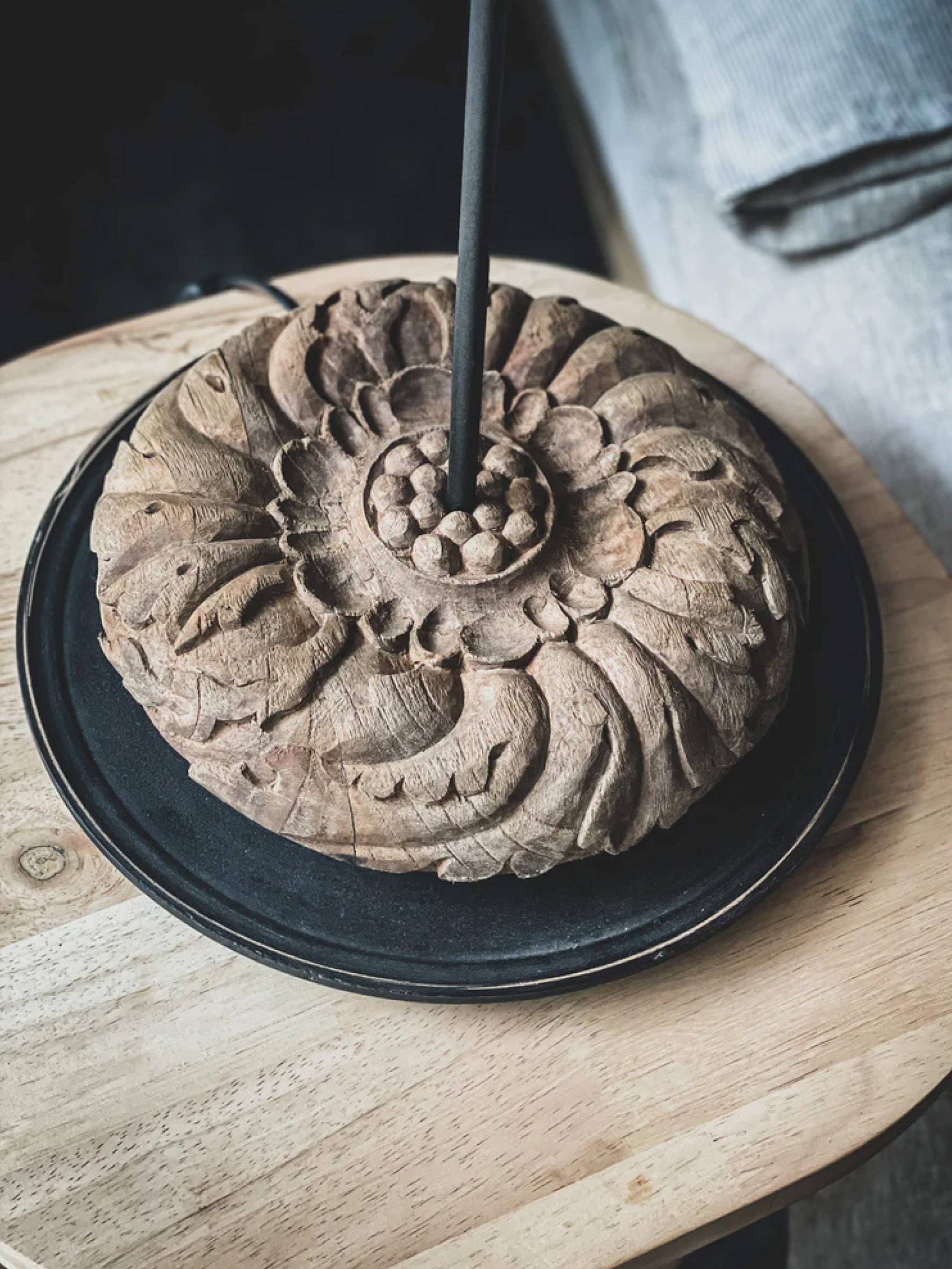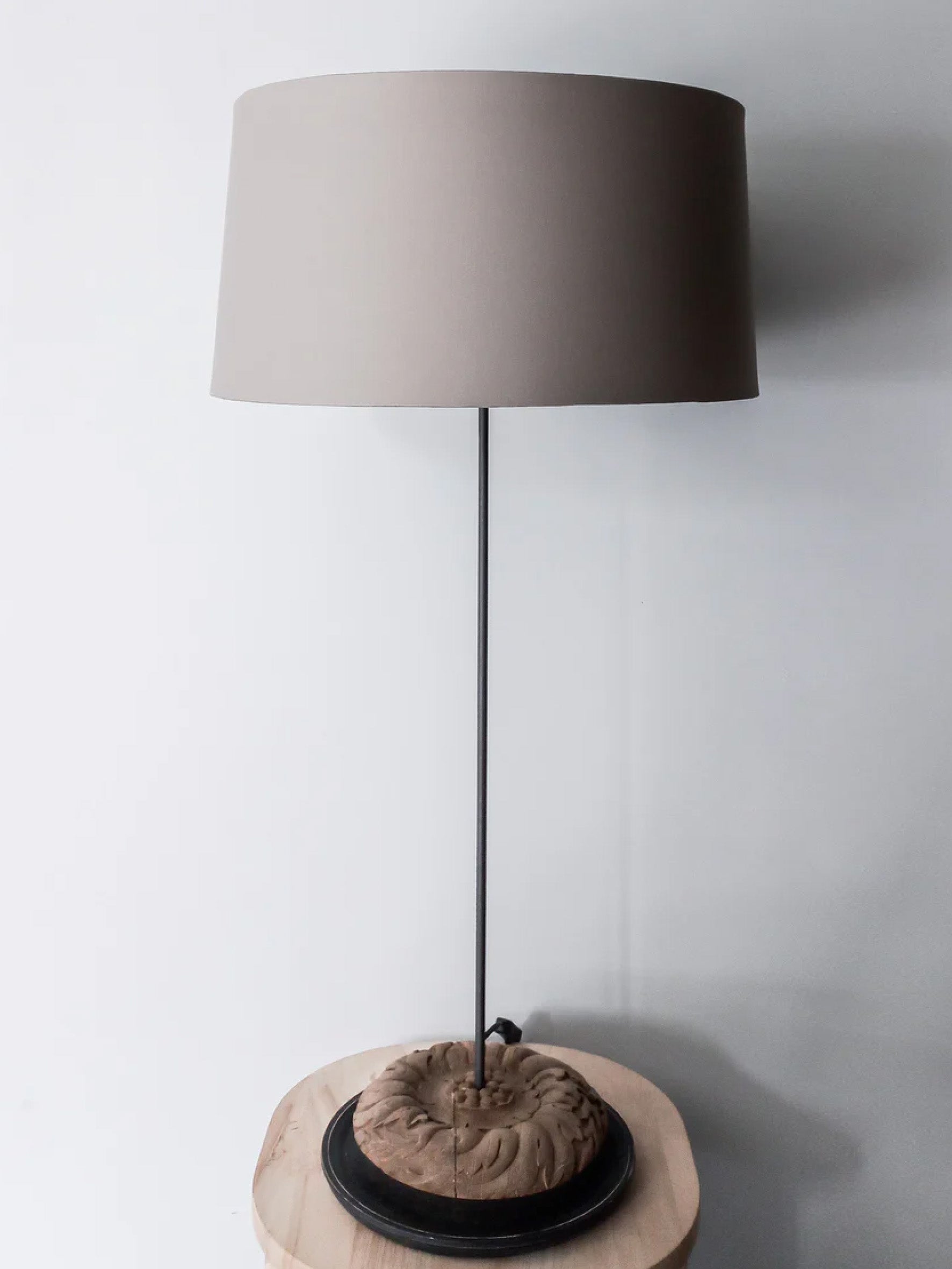 Tall and elegant like a fairy. This table lamp will gracefully adorn any living space. Carved wooden base made from weathered solid teak wood.
