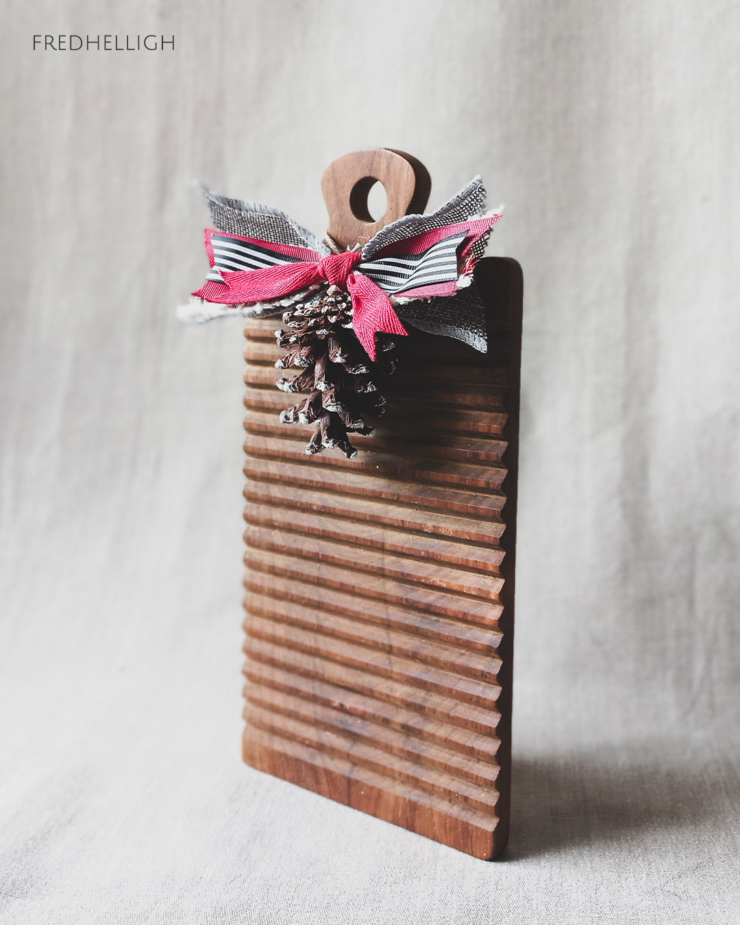 This mini washing board brings a touch of classic charm adorned with a removable ribbon that can hang beautifully on your Christmas tree.