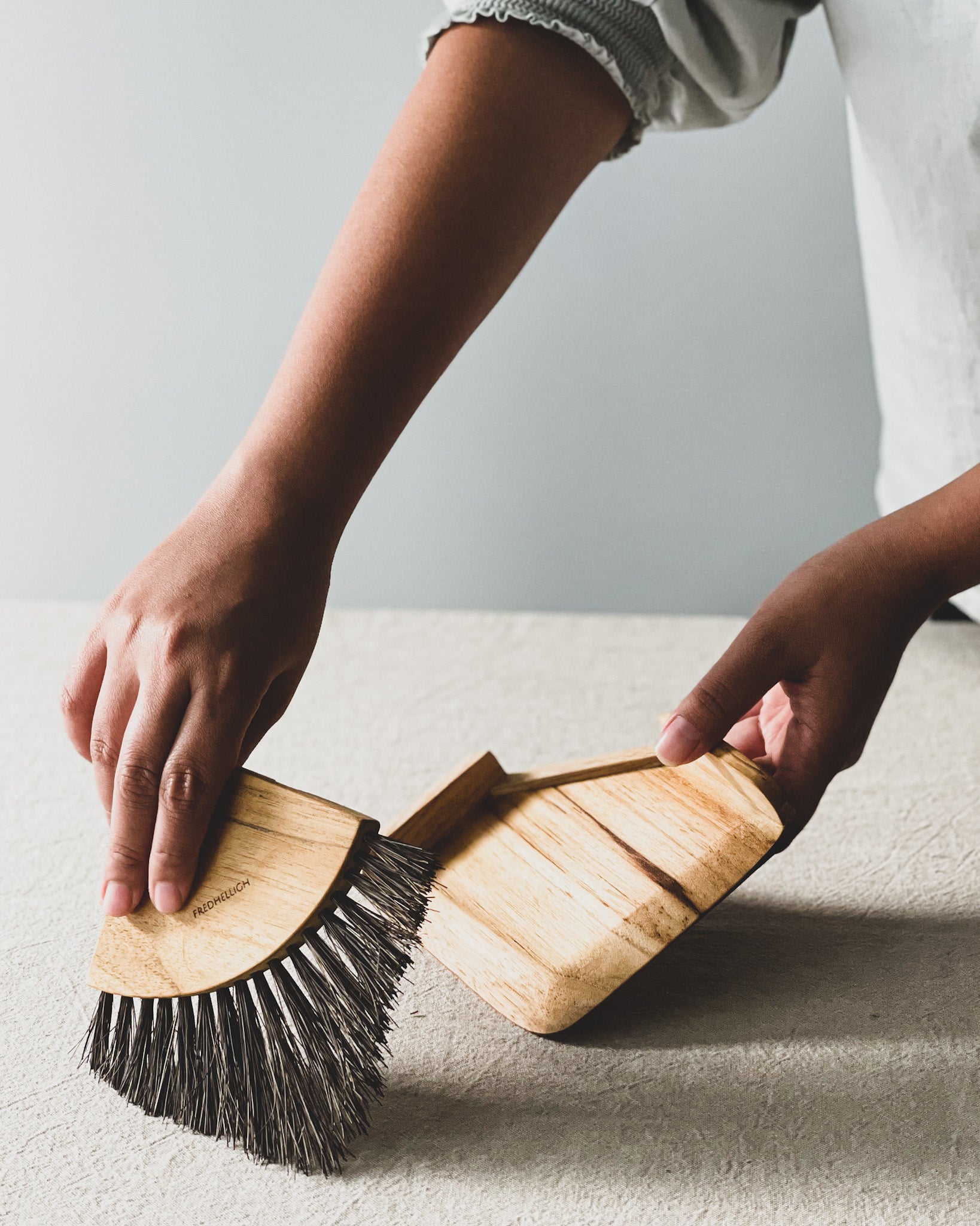 Inspired by the shape of Pomfret Fish. The handy wooden dustpan sized just right for sweeping up small messes such as breadcrumbs, dust and what not on your kitchen or dining table. As for the brush, it was shaped to reach tricky corners and creases easily. Portable enough to carry from room to room. Its sturdy bristles made from natural black sugar palm fiber (“ijuk”) combined with natural teak finish with beeswax polish.