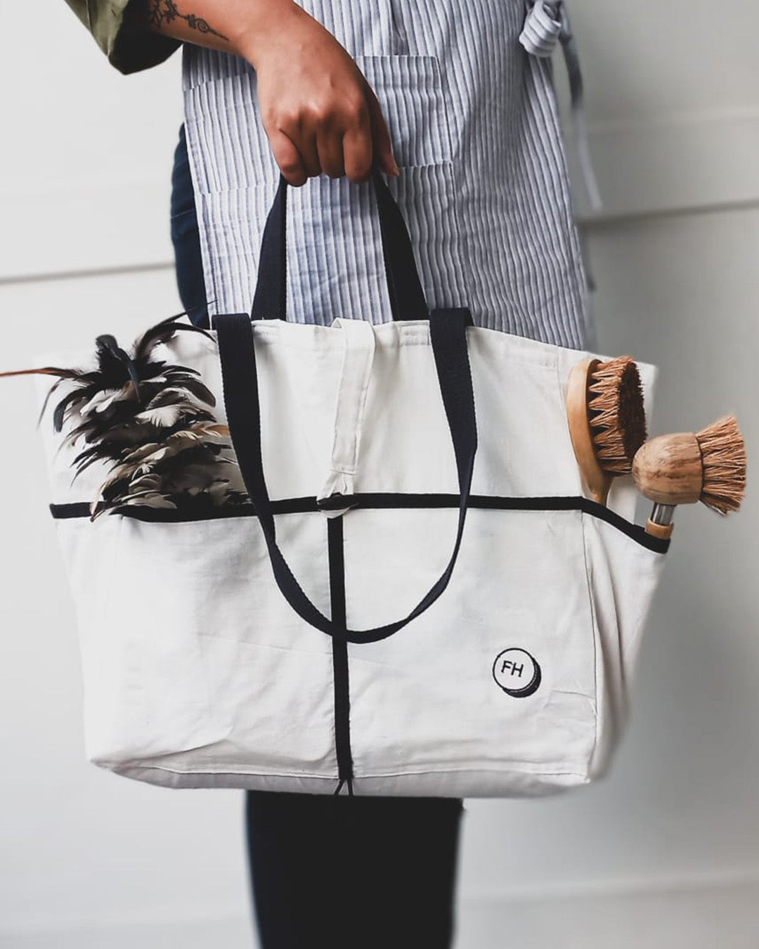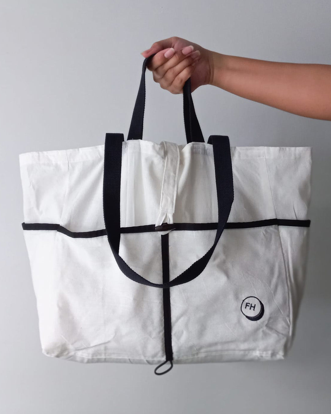 A stylish and roomy market tote bag, designed with exterior and interior pockets to hold all of your grocery needs separately. You can carry it over the shoulder or tote it in your hand. Made from cotton, light, foldable and washable.